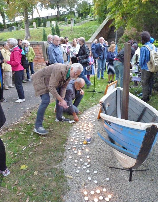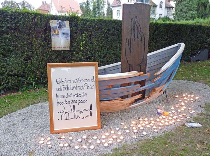 Musa Sonko, ein muslimischer Flüchtling aus Gambia, hat das Boot mit einem Text ergänzt: „Auf der Suche nach Geborgenheit, nach Freiheit und nach Frieden.“ Der 16-jährigen Mohammad aus Syrien übersetzte uns diesen Satz ins Arabische und gestaltete die Tafel.